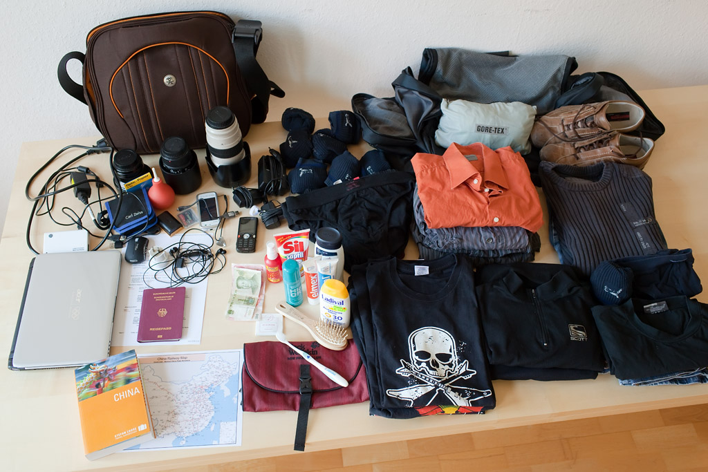 Wahrscheinlich fällt mir noch das eine oder ander ein, das ich jetzt vergessen habe aber so grob sollte mein Gepäck für China vollständig sein. Einen guten Teil macht meine Fotoausrüstung aus, dafür habe ich bei den Klamotten gespart und dafür eine Tube Waschmittel für unterwegs eingepackt. Auf dem Foto sieht man alles mit Ausnahme der 5D Mark II und dem 35/1.4, mit denen ich das Foto gemacht habe. Die kommen natürlich auch mit.
