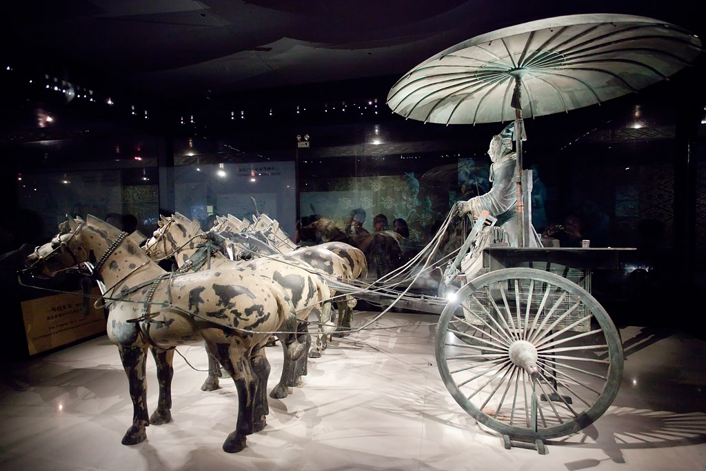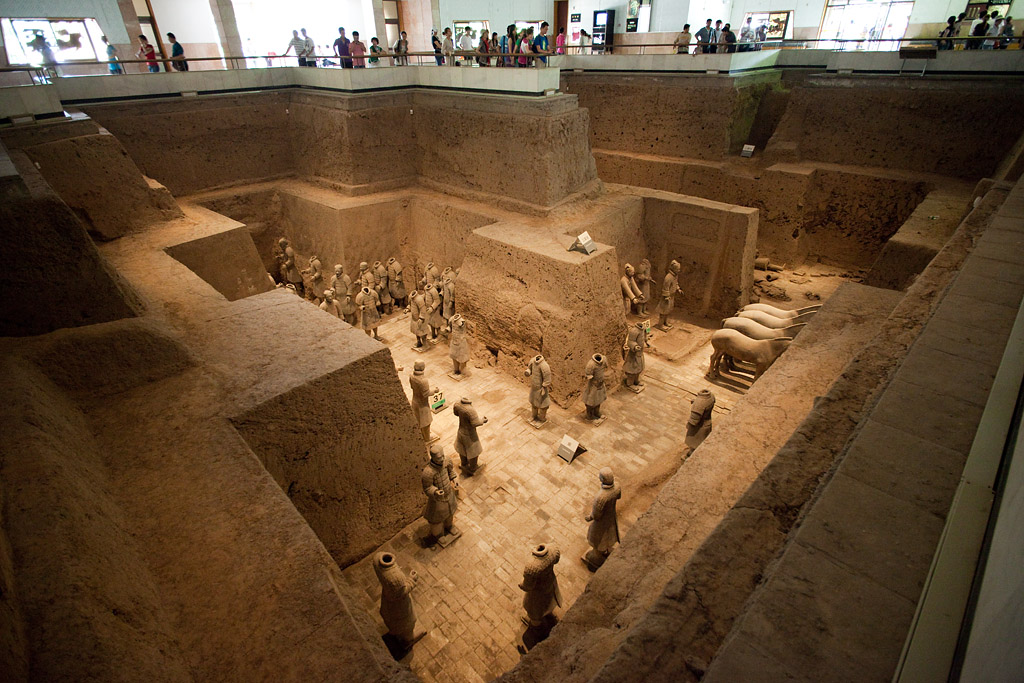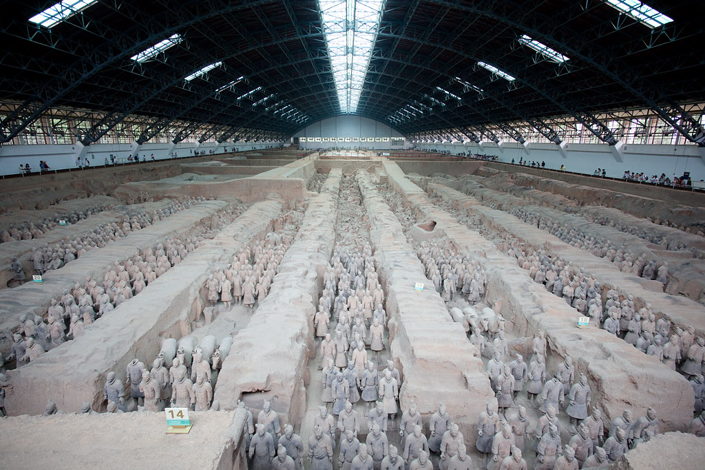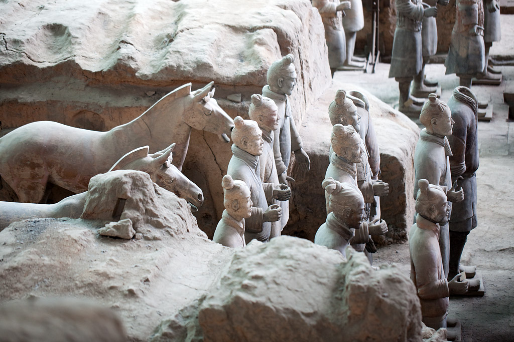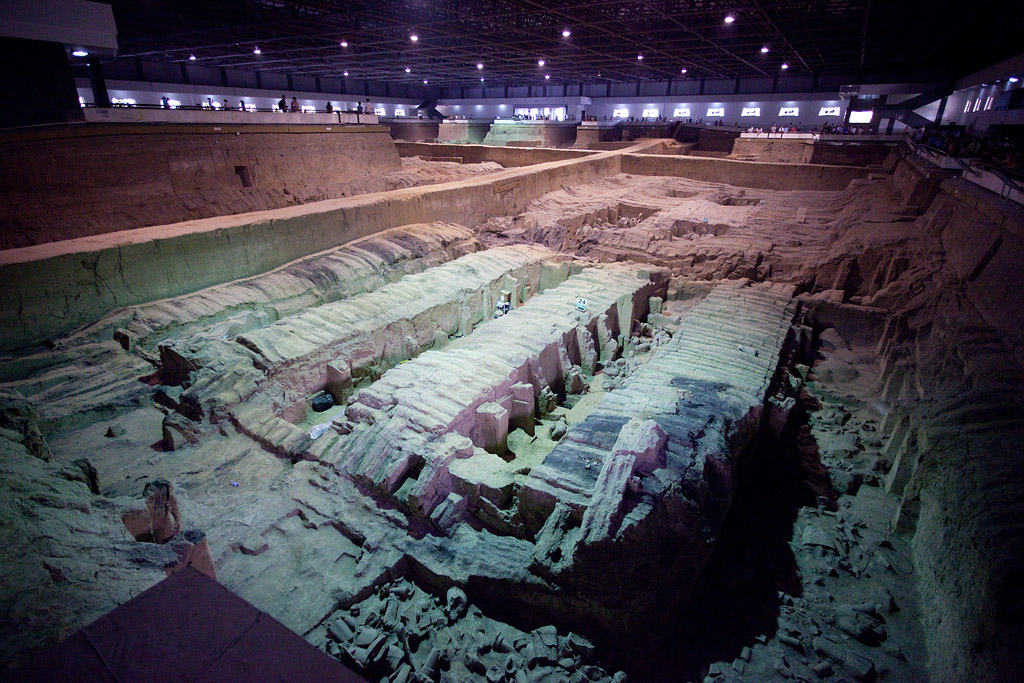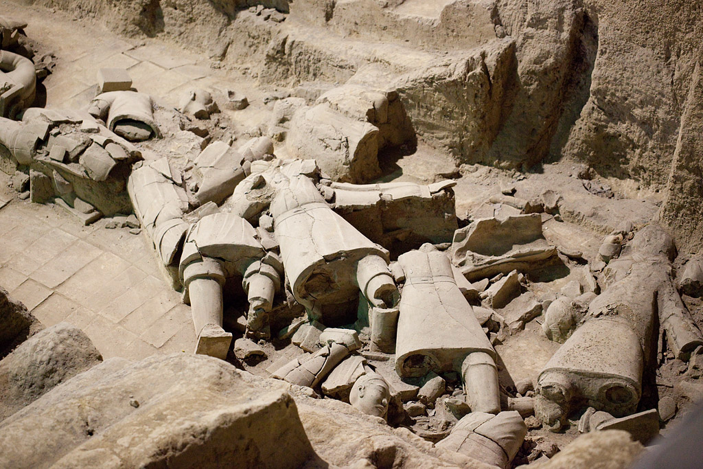 Der Zug kam etwa 20 Minuten zu früh um kurz nach 7 Uhr in Xi’an an. Für 10 Yuan (1,30 Euro) bin ich mit dem Taxi zu meinem Hotel gefahren wo man mir erst mal verkündete „no room“. Aber das ließ sich auch auflösen, indem ich statt mein gebuchtes Einzelzimmer mit einem großen Bett ein Doppelzimmer mit zwei Betten akzeptiert hatte. Mir war eh alles egal – Hauptsache die Dusche geht! Ich habe mich dann gemütlich im Zimmer breit gemacht und der Internetzugang (hier ein lustiger Kabelsalat) wurde auch repariert bevor ich so gegen halb zehn aufgebrochen bin zu meinem heutigen Ausflugsprogramm und das startete mit einem lokalen Bus, mit dem ich (zufällig) recht dicht an den Hauptbahnhof gekommen bin, von wo die Busse „306“ zu den Touristenattraktionen östlich von Xi’an fahren. Als letzter Stop nach etwa 75 Minuten Fahrzeit ist man bei dem „Terrakotta-Army-Museum“. Für den relativ hohen Eintritt von 90 Yuan (etwa 12 Euro) bekommt man detaillierten Einblick in alles was hier in den Reisfeldern gefunden worden ist. Man hat drei „Gruben“ entdeckt, die sehr unterschiedlich groß und erhalten sind. Die seit 1974 stattfindenden Ausgrabungen sind auch noch lange nicht abgeschlossen. Viele der Tonkrieger liegen auch noch sehr in Einzelteilen herum.