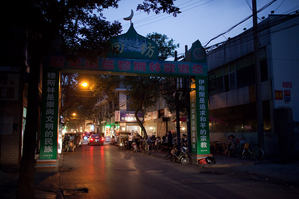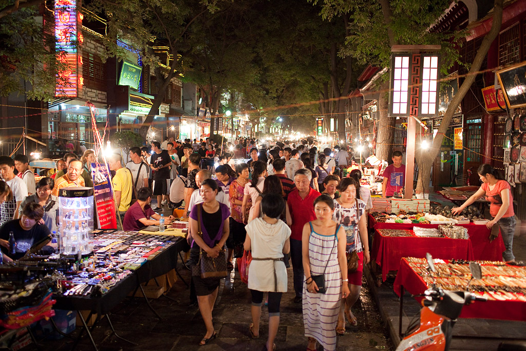 So gegen 14:30 Uhr war ich wieder in der Stadt. Schon ab morgens war es sehr warm und gegen Mittag konnte man sich selbst Schatten spenden, was gegen die Hitze oberhalb von 30 Grad aber auch nicht wirklich half. Nach etwas Herumlaufen bin ich daher erst mal ins Hotel und erst mit Einbruch der Dunkelheit wieder raus. Interessant ist in Xi’an das Moslemviertel mit viel Altbau und belebten Straßen. Diese gehen nahtlos über in den Souvenirmarkt hinter dem „Trommelturm“. Als es einen sehr kurzen Schauer gab brach auf dem Markt eine Art Panik aus, als die Verkäufer ihre Ware in Sicherheit brachten oder große Schirme aufspannten. Nach 10 Minuten war der Spuk vorbei und es blieb ab dann trocken.