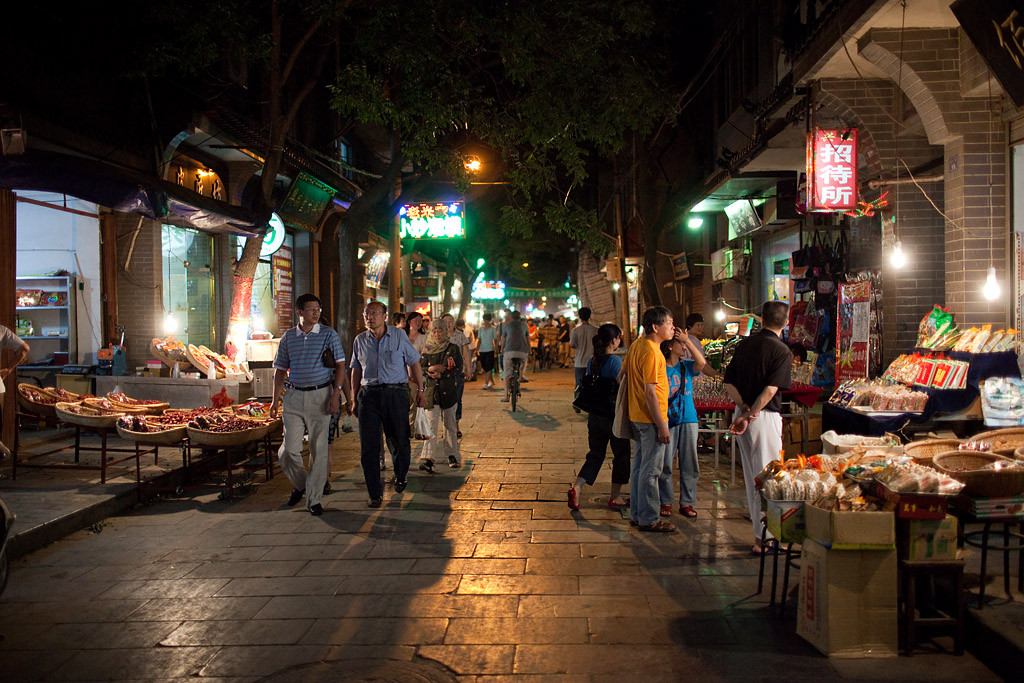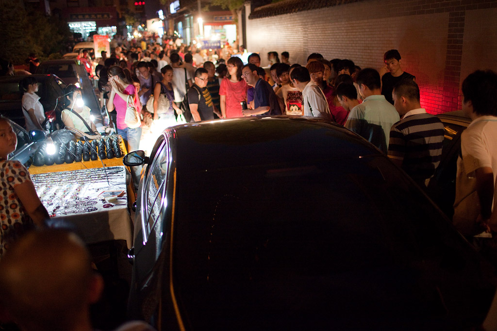 Manchmal hat man den Eindruck, die Chinesen wüssten genau was es zu tun gibt und ab dann denken sie nicht mehr nach. So entstehen Situationen wie diese wo einer mit seinem dicken Auto teils hupend durch den Nachtmarkt voller Stände und Leute durch will.