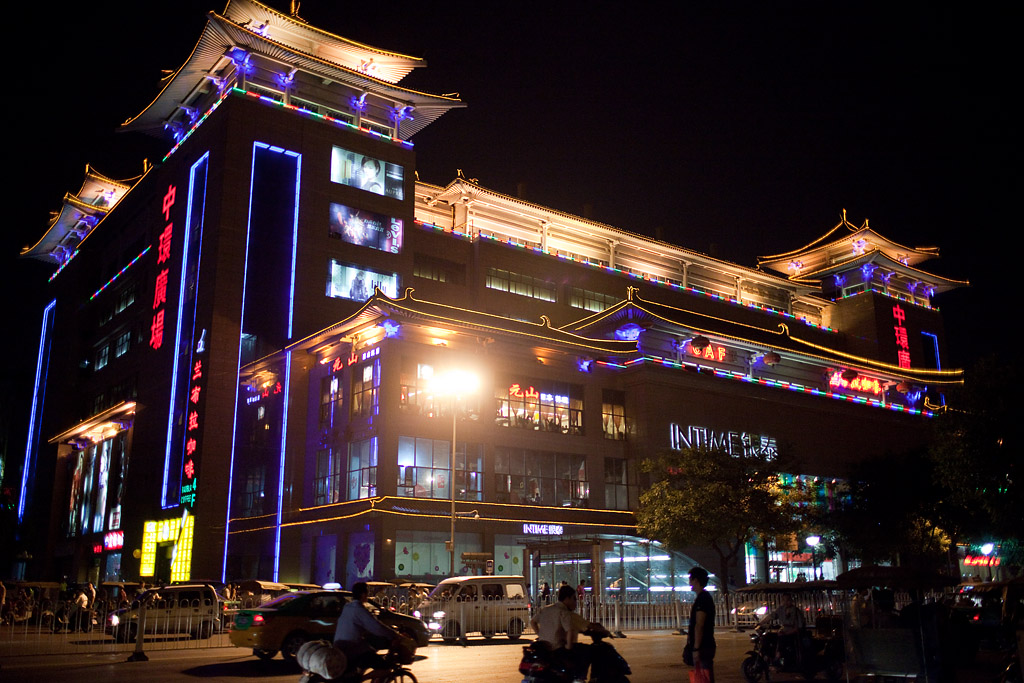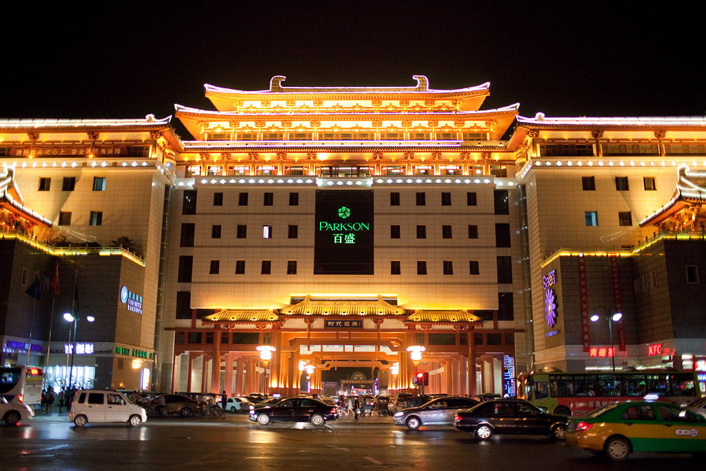 Ganz in der Nähe meines Hotels befinden sich zwei große Kaufhäuser. In Xi’an hat man sich offenbar bemüht, auch moderne Bauten in das Stadtbild einzufügen.