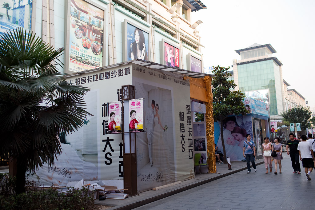 Ein irre großer Markt scheinen in China kitschige Model- und Hochzeitsfotos zu sein. Es gibt gerade in den absolut bevorzugten Lagen teils riesige Läden, in welchen die Kundschaft sich alle möglichen Fotos angucken kann, die man so von sich machen lassen kann. Wenn man sieht wie sich Chinesen normal so gegenseitig auf der Straße fotografieren (möglichst monoton hinstellen und abdrücken) ist dieser große Bedarf natürlich verständlich. Andererseits verwundert es schon, dass die Bereitschaft offenbar sehr hoch ist, für schöne Fotos auch richtig Geld hinzulegen. Auf dem folgenden Foto konkurrieren in der Hauptfußgängerzone von Xi’an gleich mehrere Anbieter mit Pavillions. Zu den Pavillions gehören noch große Ladengeschäfte, die teils über mehrere Stockwerke gehen.