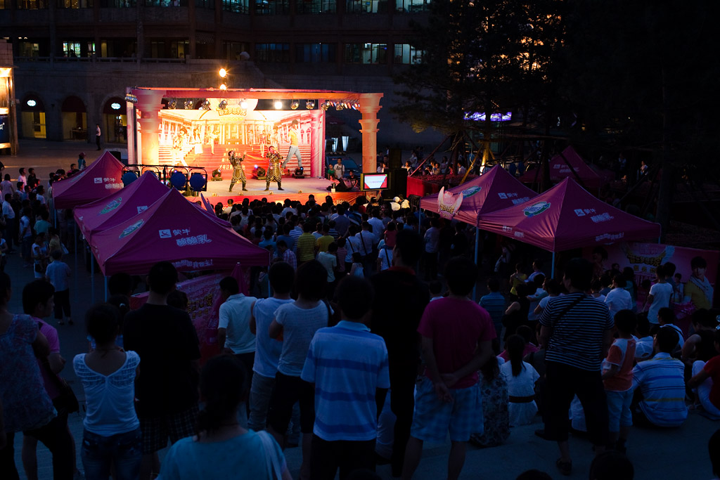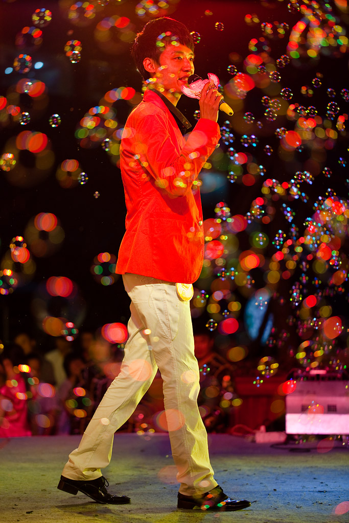 Hinter dem Glockenturm fand gerade so etwas wie ein Talentwettbewerb statt, bei dem mehr oder weniger normale Leute auf die Bühne gingen und ein Lied zum besten gaben. Die beiden auf dem ersten Foto haben wohl die Grand Prix-Geschichte von Deutschland studiert und ein Erfolgsrezept ausgemach. Noch heißer war natürlich der folgende „seventies revival“-Auftritt des chinesischen Roland Kaiser mit der Bühne in Seifenblasen getaucht …