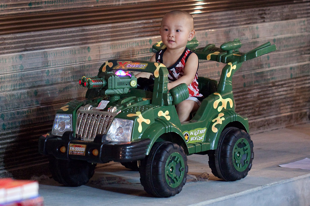 Und ein Schnappschuss aus einer Seitenstraße des Nachtmarkts. In Deutschland würden die Eltern vermutlich gesteinigt, wenn der Kleine mit etwas derart militaristischem den Kinderspielplatz entern würde …