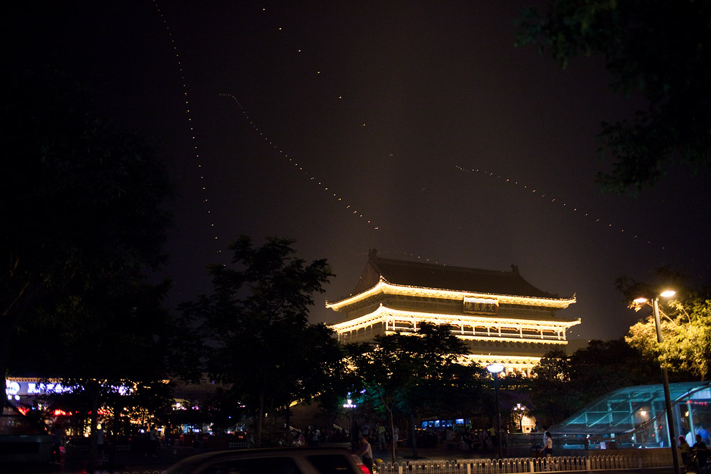 Rund um den Trommelturm ließen Souvenirverkäufer ihre Drachenketten gen Himmel starten. Obwohl wenig Wind war funktionierte das sehr gut.
