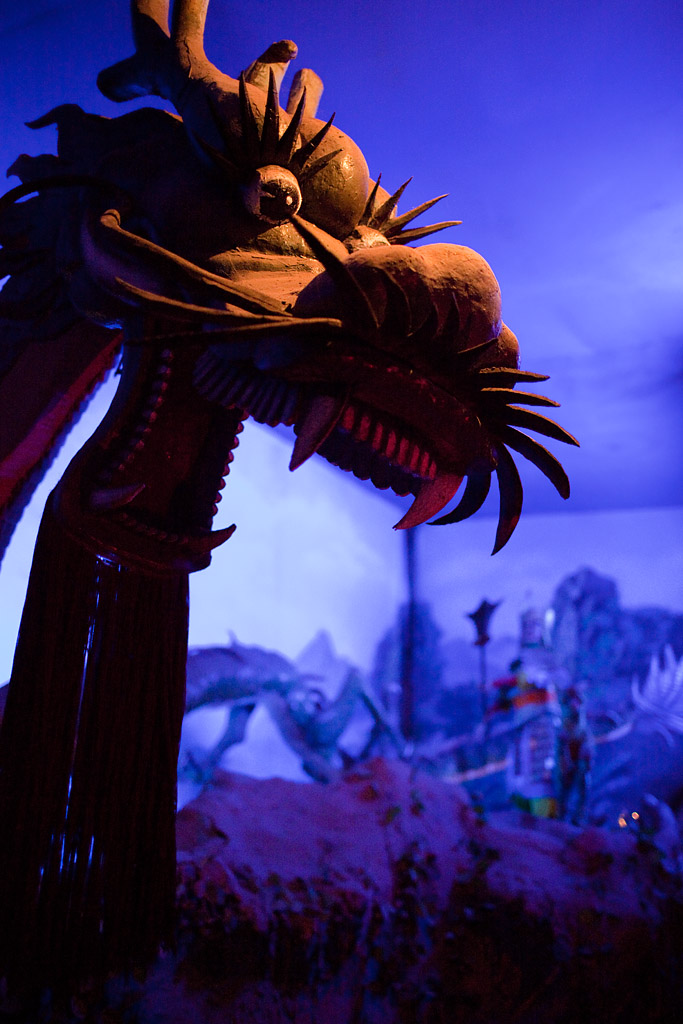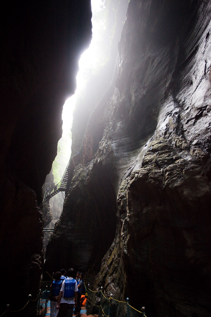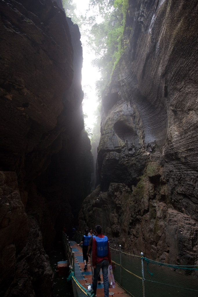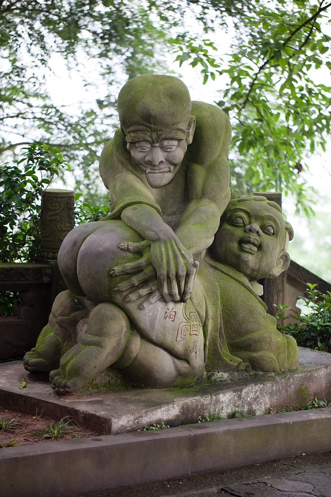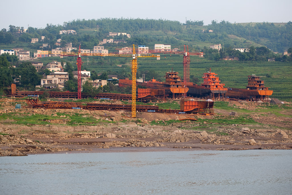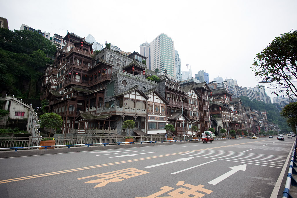 Chongqing liegt am Zusammenfluss des Yangzi (braunes Wasser) mit dem Jialing (eher grünes Wasser) und das Zentrum befindet sich auf der Halbinsel direkt vor dem Zusammenfluss. Meine Erwartung einer lebendigen Hafenstadt wurde etwas enttäuscht. An den Flüssen entlang führen breite Hauptverkehrsstraßen, die auf der Landseite von unansehnlichen Hochhäusern gesäumt werden. An einer Stelle hat man in den Fels (Chongqing ist sehr hügelig) eine Ansammlung von Häusern gebaut, die wohl traditionell anmuten sollen und Innen mit Souvenirläden und Restaurants vollgestopft sind.