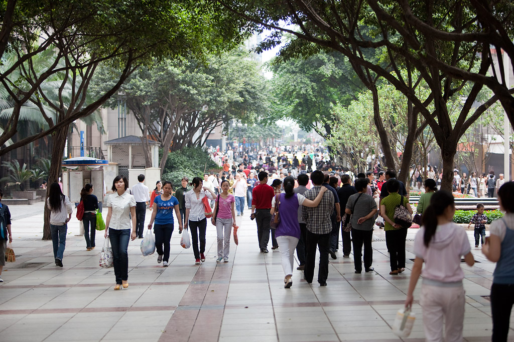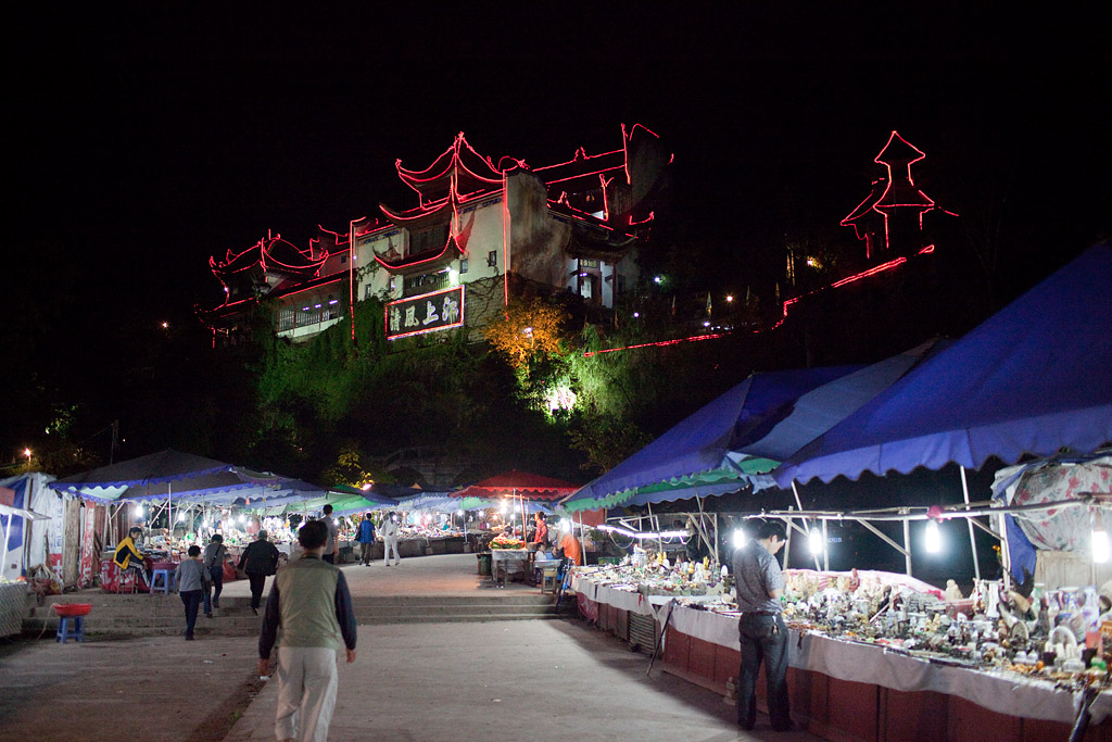 Vom Ufer ist es gar nicht so leicht auf das deutlich höher gelegene Zentrum zu gelanden, da es so gut wie keine Verbindungsmöglichkeiten für Fußgänger gibt. In der Tourifalle gab es schließlich einen Fahrstuhl, der einen nach oben brachte. Das Zentrum selbst ähnelte dem von Kunming. Noble Klamottenläden und Kaufhäuser reihen sich in modernen Hochhäusern aneinander und von Leben auf der Straße ist nichts zu sehen.