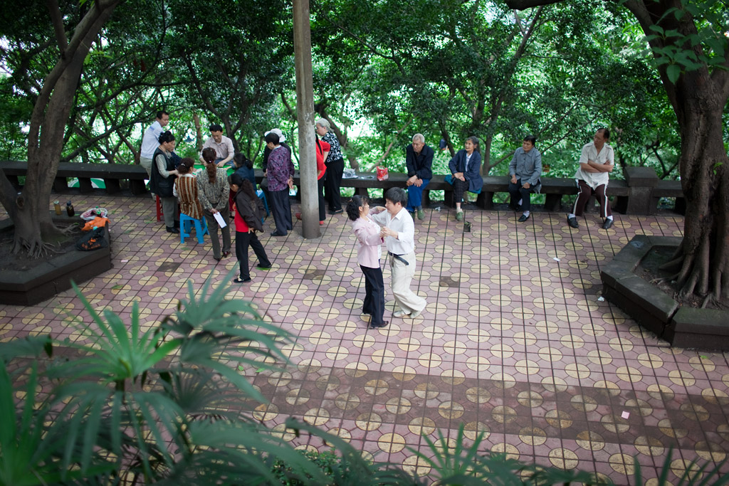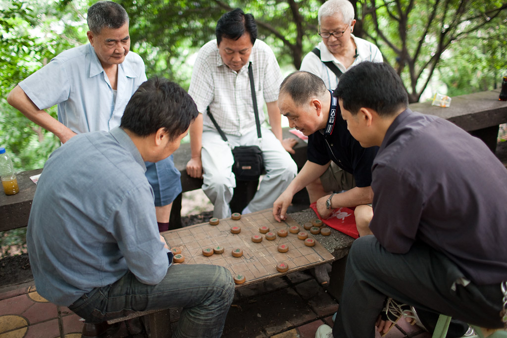 Ich steuerte dann noch den einzigen grünen Fleck auf dem Stadtplan weit und breit an und der erwies sich als Treffpunkt der einfachen Chinesen der Gegend. Dort wurde unter Bäumen getanzt und gespielt. In die Bäume wurden Käfige mit Singvögeln gehängt, so dass der ganze am Berghang gelegene Park vom Vogelgezwitscher erfüllt war. Dort habe ich eine Weile Chiang-Xi-Spielern zugeschaut – Go gab es leider mal wieder nicht. Dafür gab es ganz ungeniert Pflegestationen für Füße. Und abgehobelte Hornhaut blieb dann eben einfach auf dem Gehweg liegen.
