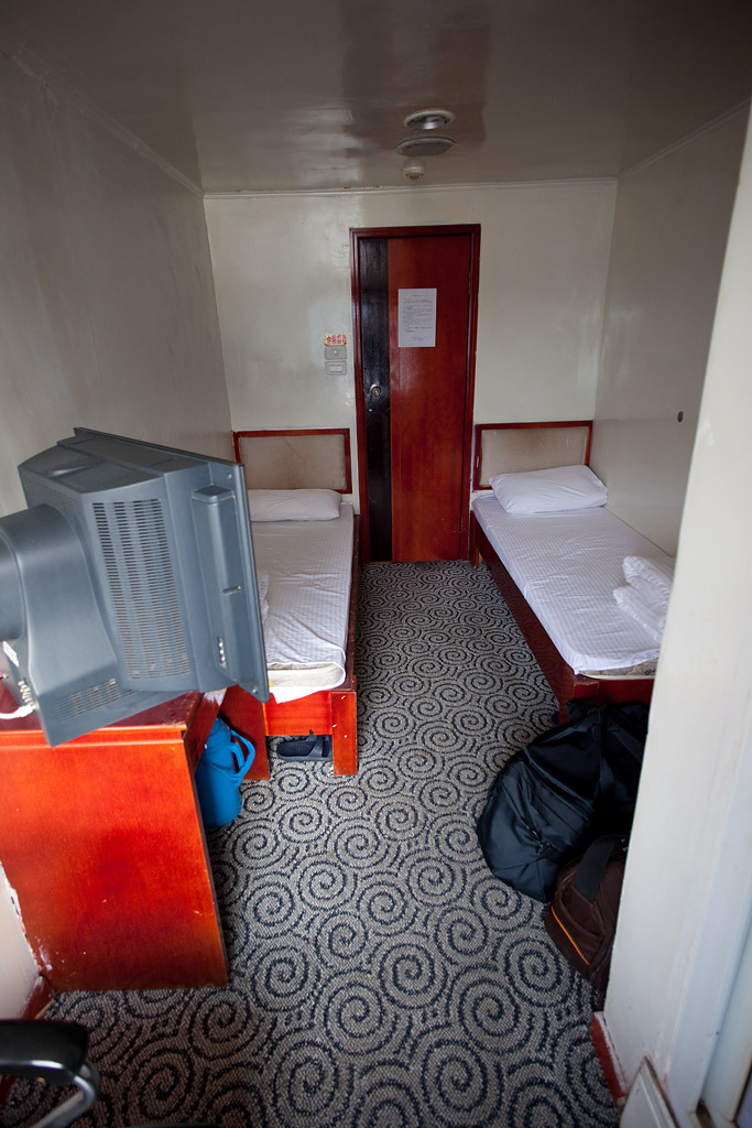 Auf dem Weg zur Fähre konnte ich noch ausgiebig einkaufen, so dass ich zumindest was Getränke angeht die nächsten Tage von dem Angebot der Fähre unabhängig bin. Kurz nach 18 Uhr kam dann auch mein Agent „Jimmy“ wieder zum Office und brachte mich bis auf die Fähre in mein Zimmer. Ich habe noch einen Zimmerschlüssel bekommen, für 60 Yuan den Zusatzservice auf Schiff gebucht (beispielsweise darf man auf’s Aussichtsdeck), sowie eine Erkennungsmarke für das Sightseeing-Programm bekommen. Zum Raum habe ich ja einleitend schon was geschrieben, hier noch die Fotos zur Dokumentation. Beim Blick auf den Anleger kann man mein Schiff leider nich richtig erkennen. In der Mitte ist eines der „Luxus-Klasse“, das rechts daneben auch und danach – aber eben verdeckt vom Anleger – das Schiff, mit dem ich unterwegs bin.