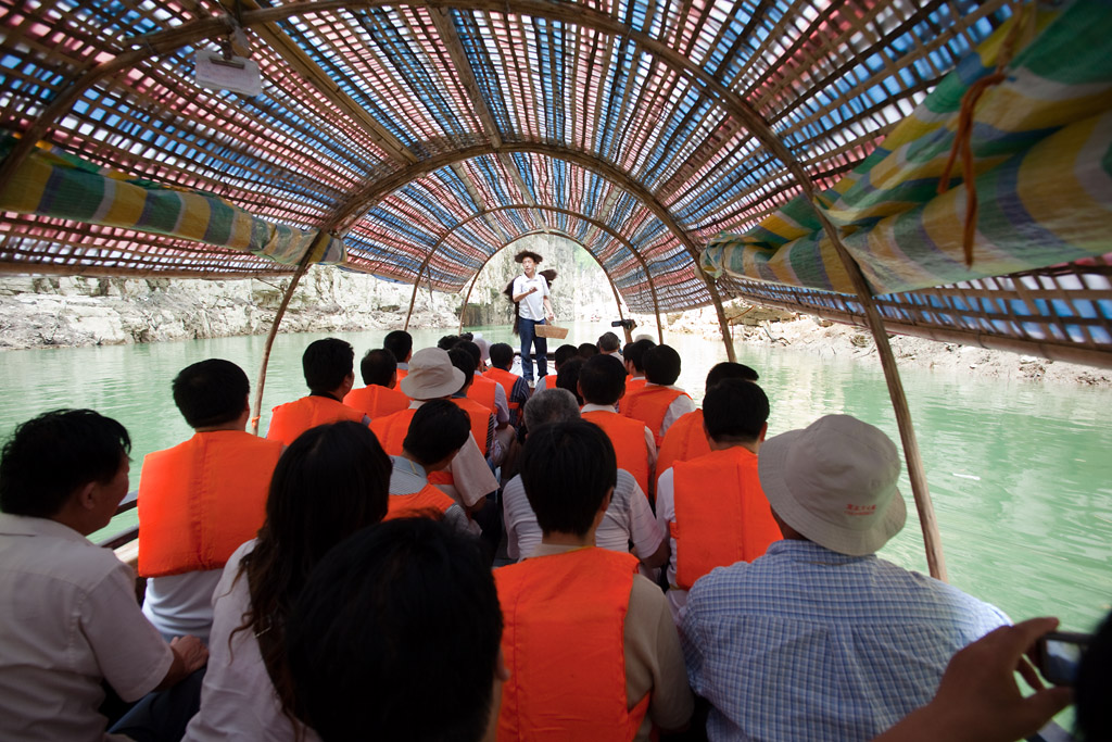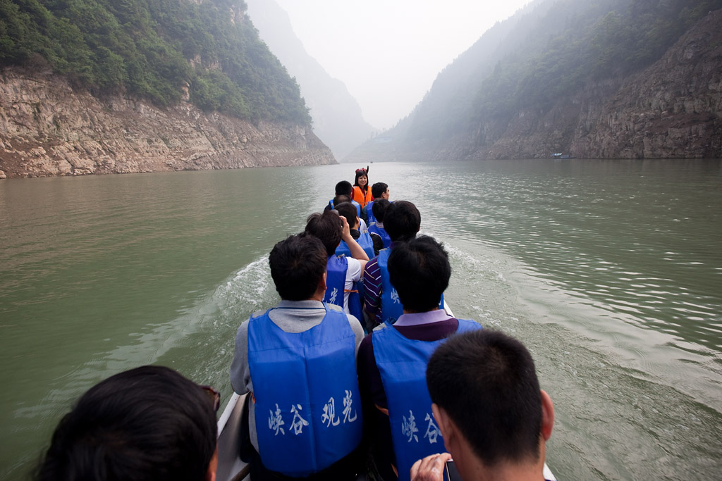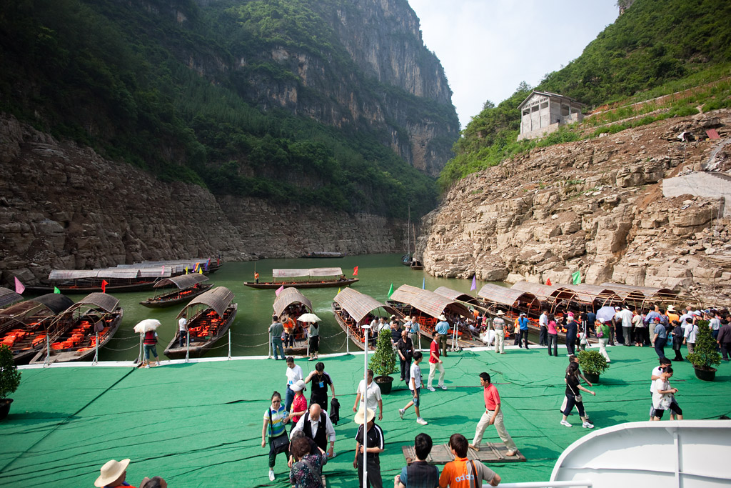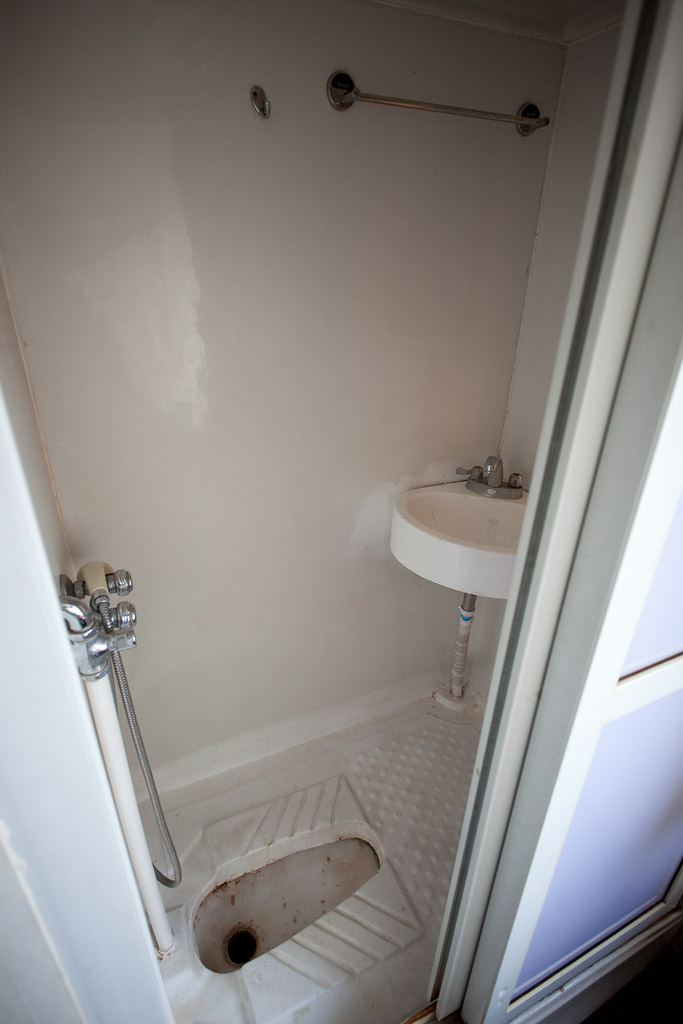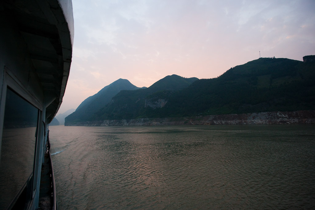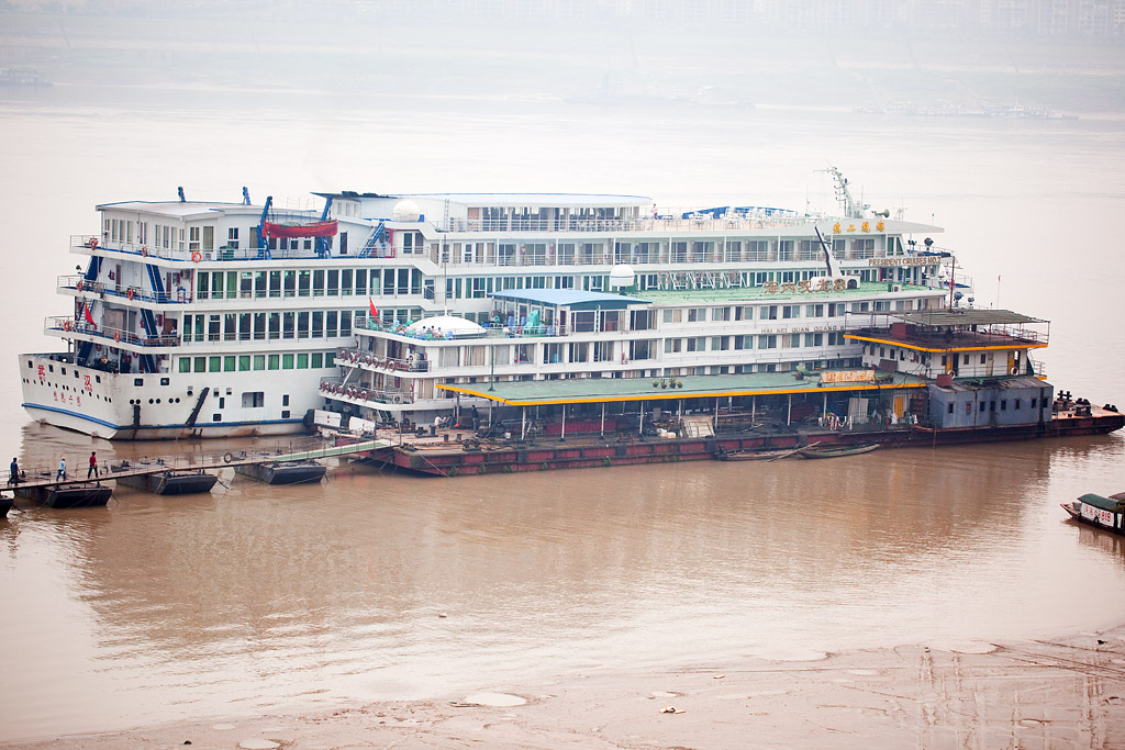 Puh, das kann ja was werden mit dem „Domestic Ship“ auf dem Yangzi. Ich habe gerade eingecheckt und, naja, sagen wir, ich hatte schon mit einer gewissen Bandbreite gerechnet was so die Qualität angeht. Die Realität ist aber doch schon ziemlich am unteren Ende womit ich so gerechnet hatte. Okay, es gibt eine freie Steckdose, da hatte ich nicht unbedingt mit gerechnet. Dafür beispielsweise keine Handtücher, die Naßzelle ist Klo (Loch im Boden), Dusche und Waschstelle in einem. Testweise habe ich mal die Wasserhähne aufgedreht. Warm tut sich gar nichts (gibt’s vermutlich nur zu bestimmten Uhrzeiten) und bei kalt kam einen kurzen Moment vernünftiges Wasser raus und seitdem nur braune Brühe … hoffentlich ändert sich das wieder. Vom Geruch her ist’s auch nicht so völlig optimal. Wahrscheinlich werde ich es halten wie die Chinesen und die Hygiene auf’s nötigste beschränken und mich auf das vermutlich anständige Hotel in Xian freuen (Fotos der Kabine gibt’s am Ende dieses Beitrags). Ich habe aber einen sehr netten chinesischen Jungen so knapp unter 20 würde ich schätzen als Zimmernachbarn, der sogar recht ordentlich Englisch redet. Später gab es noch eine Änderung und statt des Jungen schlief sein Vater bei mir im Zimmer – allerdings habe ich ihn kaum gesehen.