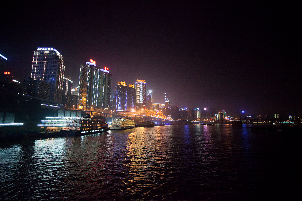Nach Sonnenuntergang zeigt sich Chongqing am Fluss schon interessanter. Die graue Kulisse der Wolkenkratzer verändert sich zu einem bunten Lichtermeer, zu dem auch Ausflugsschiffe beitragen. Auf dem Aussichtsdecks versammeln sich die mitreisenden Chinesen und spielen Karten und machen Fotos. Höhepunkt ist natürlich das Ablegen der Fähre um 21 Uhr.