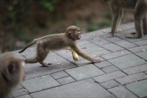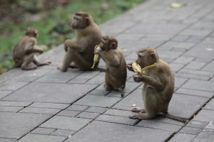Insgesamt wirkten die Affen aber nicht aggressiv und recht gesättigt. Da waren weitere Bananen auch schon mal mehr Spielzeug als Nahrung. Besonders den Affenkindern schien allein die Eroberung einer Banane wichtig zu sein und sie versuchten gelegentlich auch, sie sich gegenseitig abzujagen.