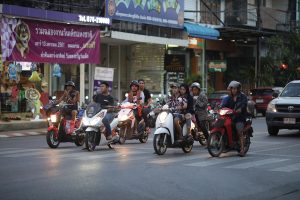 (Typisches Bild auf einer Kreuzung: Viele Thailänder sind alleine oder zu zweit auf Mofas unterwegs.)