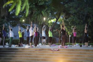 (In einem kleinen Park traf sich eine Gruppe zum gemeinsamen Yoga.)